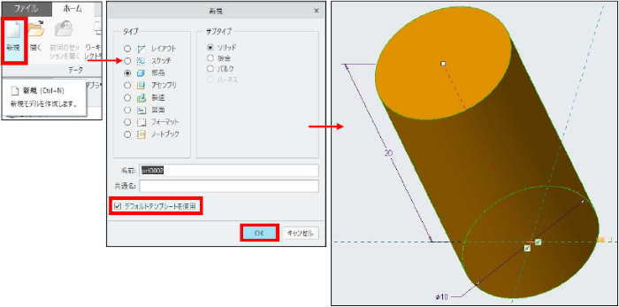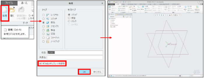 新規>部品>ソリッド>デフォルトテンプレートを使用>OK をクリックします。