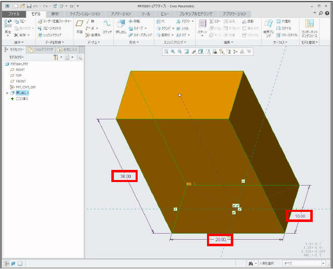 幅20.00、奥行10.00、高さ30.00 のサンプルモデル1 を作成します。