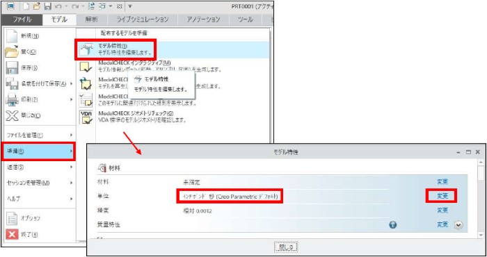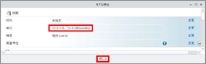 「モデル特性」ダイアログボックスの単位>変更をクリックします。