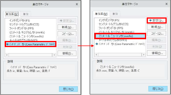 現在の選択「インチポンド秒」を「ミリメートルニュートン秒」に選択変更し、「設定」>「閉じる」をクリックします。
