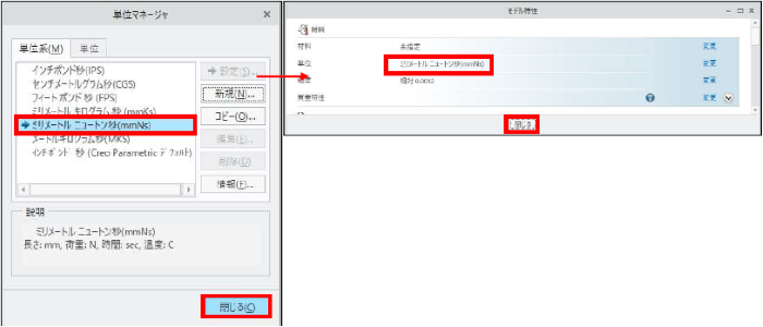「単位マネージャ」ダイアログボックスで、「ミリメートルニュートン秒」が選択されていることを確認して、「閉じる」をクリックします。