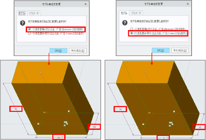 「寸法を変換」を選択した場合、元の1”が25.4mm に変換されています。