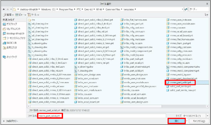 「mmns_part_solid.prt」を選択して「開く」をクリックします。