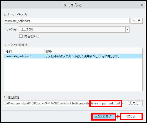 「値を設定」に「mmns_part_solid.prt」が入力されます。「追加/変更」>「閉じる」をクリックします。